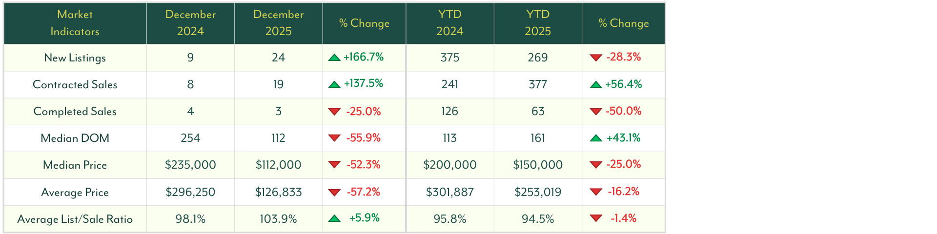In summary, December land data points to a market with renewed listing and contract momentum, improved selling times, but continued softness in completed sales and pricing, setting the stage for potential carryover activity into early 2026.