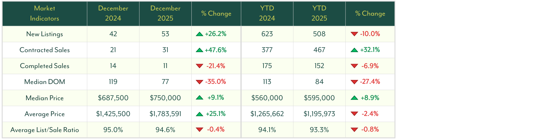 Overall, December’s home data reflects a market finishing the year with solid buyer engagement, improved marketing times, and stable pricing, even as completed sales remain somewhat constrained.
