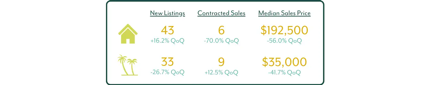 The Grand Bahama market closed the year in a more cautious, value-driven mode. While inventory stayed fairly steady, buyer activity slowed, prices shifted more affordable, and timelines lengthened. At the same time, the land segment showed early signs of improving buyer interest, even as pricing remained attractive.