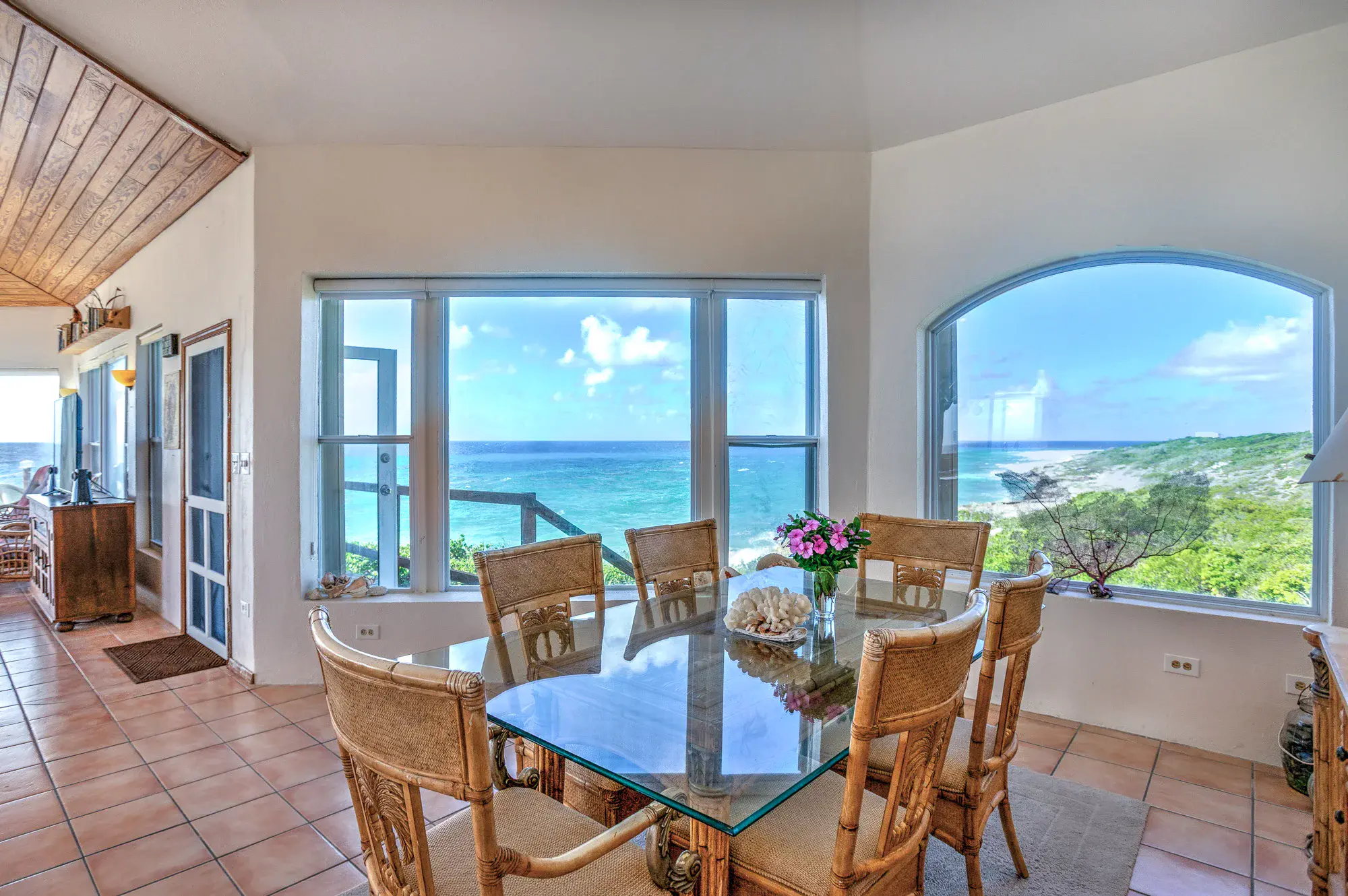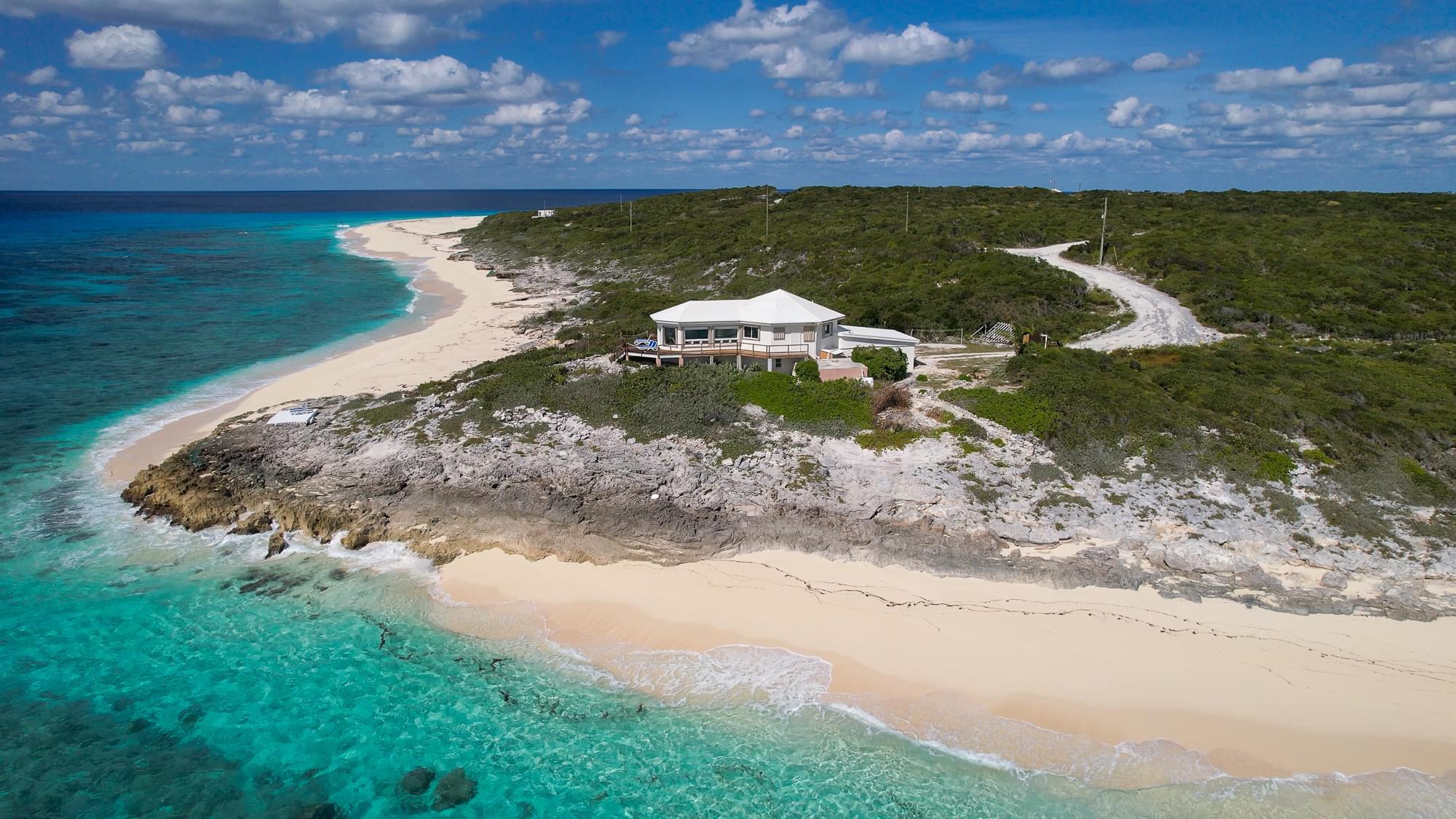 Perched on the southernmost point of San Salvador, 3 Barks offers breathtaking 225-degree panoramic ocean views that create the rare feeling of living at the edge of the world. Designed for privacy and tranquility, neighboring homes are set well apart, allowing the rhythm of the waves and brilliant star-filled skies to define each day. Built entirely of block and concrete in an elongated octagonal shape recognized for hurricane resilience, the home features expansive windows framing uninterrupted east-to-west vistas. With 367 feet of direct shoreline—both rocky and sandy—a scenic coastal walk leads to Sandy Point Beach. The open living, dining, and kitchen area flows seamlessly to a wraparound deck, ideal for entertaining. Two bedroom suites provide comfort, while the ground level offers a garage, workshop, laundry, and storage. Fully furnished and turnkey, 3 Barks is ideal as a private retreat or vacation rental investment.